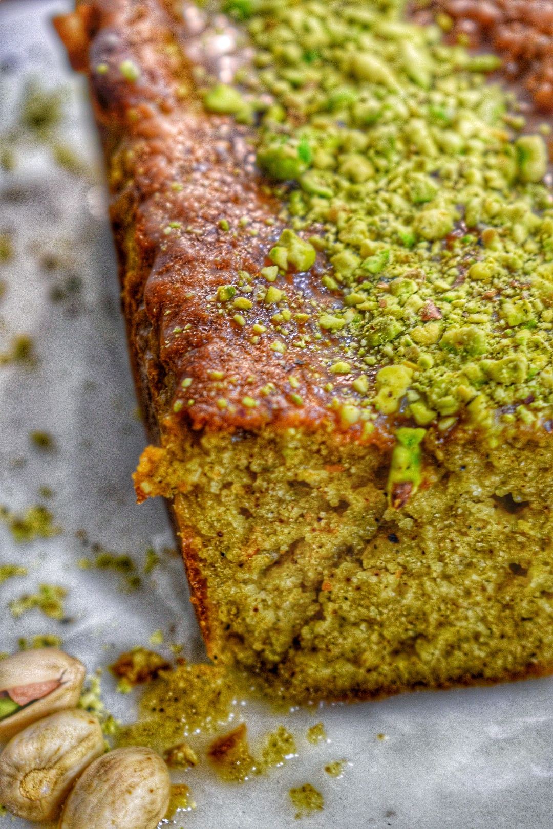 9. Gently pour on top of the cooled bread and top with crushed pistachios.
